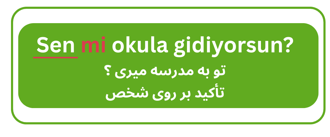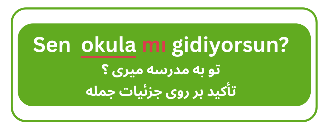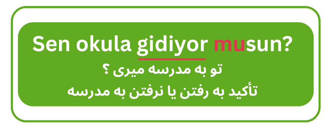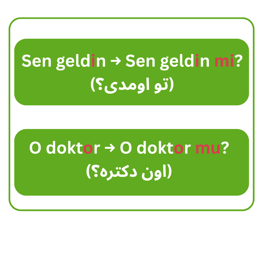 در زبان ترکی استانبولی، برای پرسیدن سوال، برخلاف فارسی یا انگلیسی که ترتیب جمله تغییر میکند، فقط کافیه پسوند پرسشی mi/mı/mu/mü رو به جمله اضافه کنی.